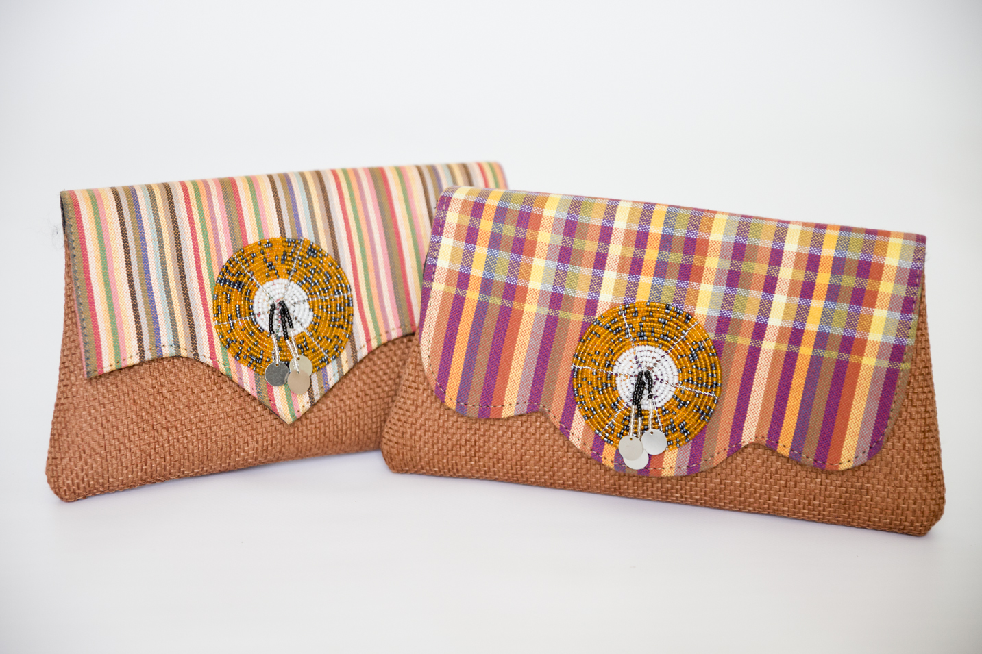 Carteras con estampados africanos y acabados artesanales. Pequeñas obras de arte.